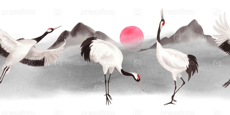 Бесшовные границы японских кранов с пейзажом на заднем плане. Иллюстрация акварели ручной работы. Для ткани, обоев, поздравительных открыток, дизайна, декора и иллюстрации