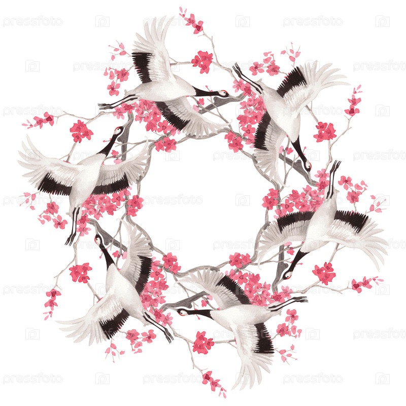 Венок из летающих японских журавлей и вишен. Иллюстрация ручной акварели. Для ткани, обоев, поздравительных открыток, дизайна, декора и иллюстрации