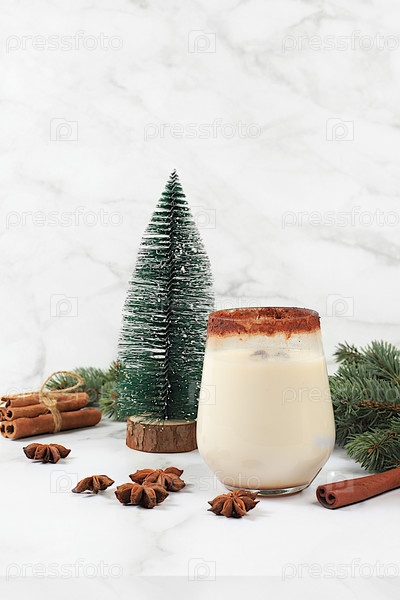 Яичный ног с корицей, звездочным анисом и мускатным орехом на Рождество и зимние каникулы на мраморном столе со смоковницами