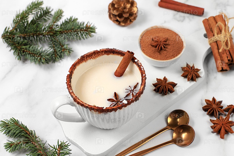 Яичный ног с корицей, анисом и мускатным орехом на Рождество и зимние каникулы на мраморном столе