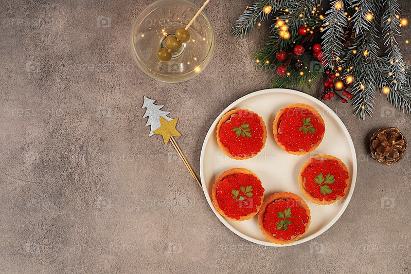 Рождественские и новогодние блюда, салфетка для праздничного стола.Плата с пирожными тортами и красной икры на бетонном столе со стаканчиком вина и оливков, концепция канун Рождества, меню ресторана