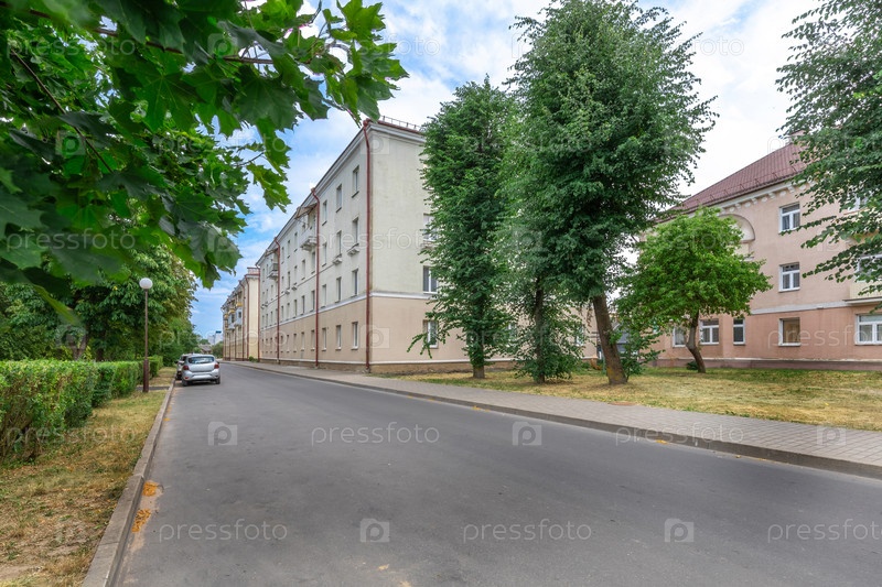 Тихая жилая улица с многоквартирными домами, зелеными деревьями и припаркованными автомобилями в яркий летний день
