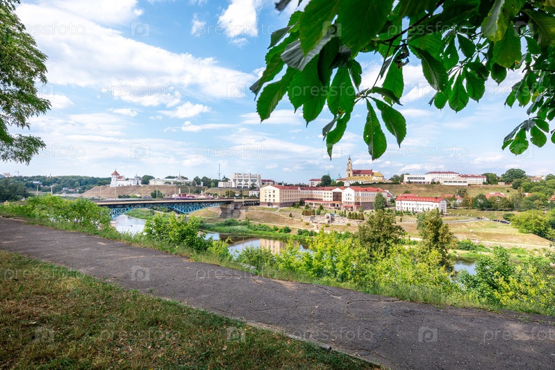 Панорамный вид на город Гродно с рекой Неман и зелеными деревьями
