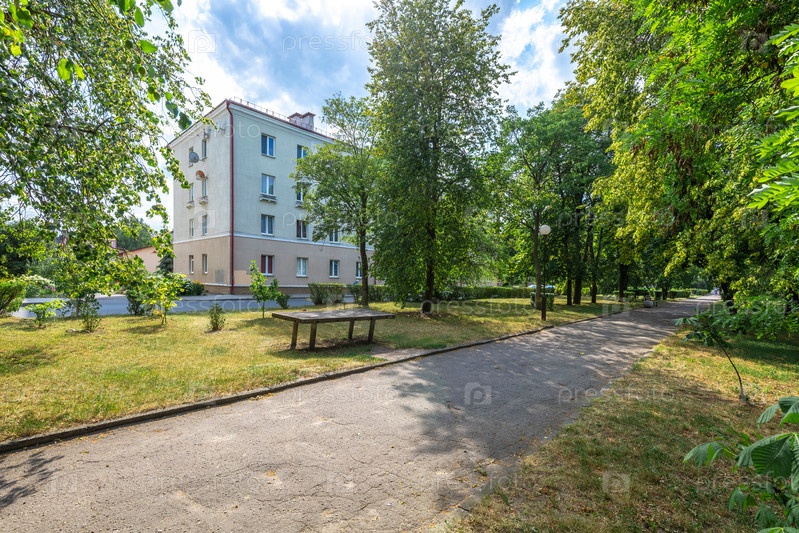 Спокойный жилой район с зелеными деревьями и жилым домом