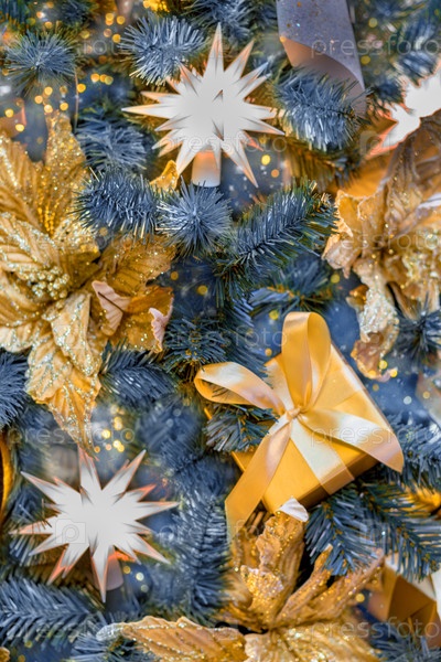Праздничная рождественская елка в голубых тонах, украшенная золотыми поинсеттиями, звездочкой и упакована в подарок