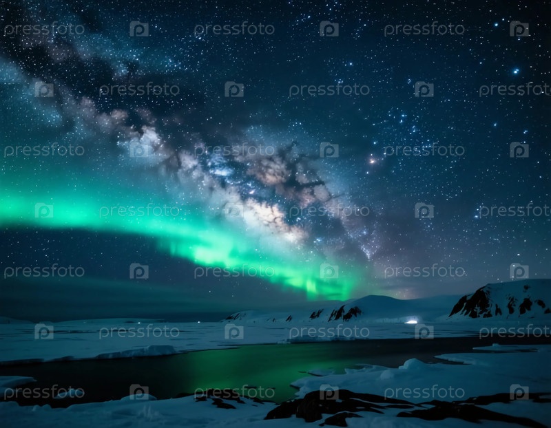 В тишине рождественской ночи яркие северные огни танцуют по темному небу над снежной тундрой, отражаясь на спокойных водах ниже, создавая завораживающее зрелище генеративного ИИ