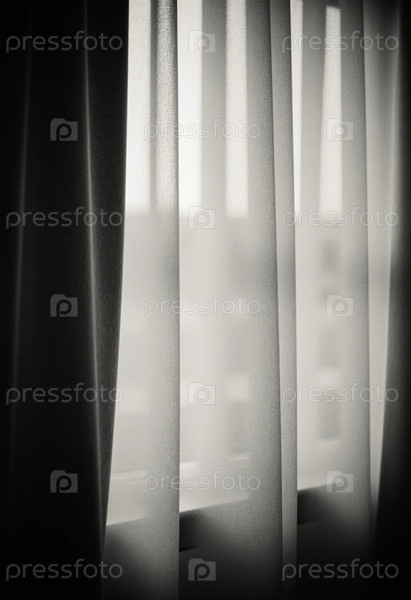 Черные шторы изящно висят у окна, мягко раскачиваясь от легкого ветра.Солнечный свет нежно фильтрует и бросает тонкие тени в комнату