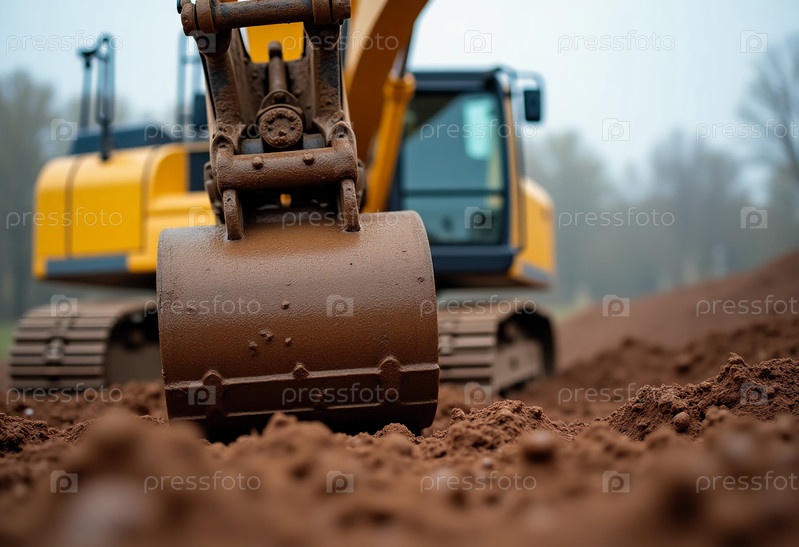 Тяжелая техника усердно работает, экскаватор проникает в богатую коричневую почву на строительной площадке, окруженной природой