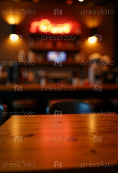 Красиво выполненный деревянный стол ждет посетителей в уютном бар-кафе, освещенном теплыми огнями, которые улучшают привлекательную атмосферу генеративного AI