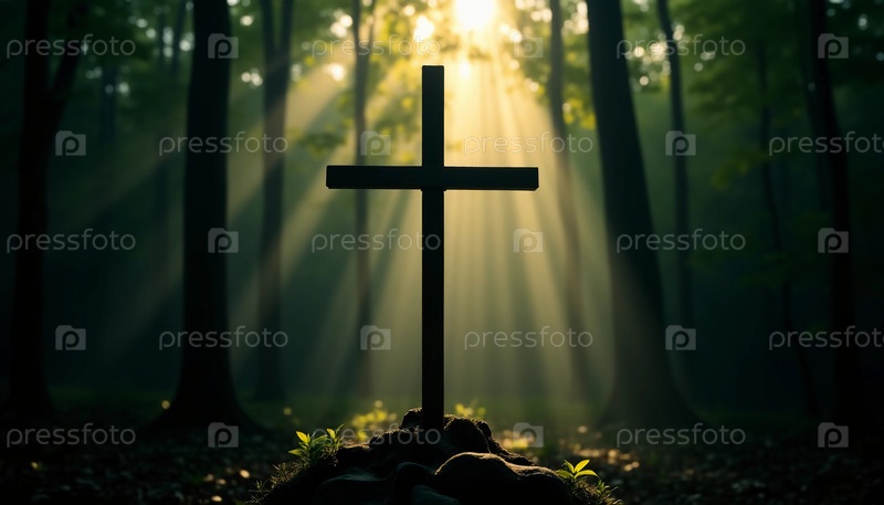 Солнечный свет фильтрует высокие деревья, освещая деревянный крест, который гордо стоит среди богатой земли и молодых растений, создавая спокойную атмосферу обновления и духовности