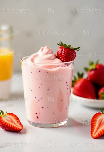 Кремный клубничный йогурт умело представлен в прозрачном стекле, украшенном спелыми ягодами.Свежие ягоды и апельсиновый сок улучшают освежающий вкус Generative AI breakfast