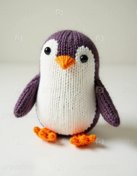 Очаровательная ручная игрушка пингвина с фиолетовым телом и оранжевыми акцентами опирается на гладкую поверхность, отражая шарм вязаного ремесла в теплой обстановке мастерской Generative AI