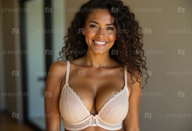 Женщина демонстрирует свое стильное нижнее белье, излучая уверенность в себе, когда ее локоны обрамляют её радостное выражение лица