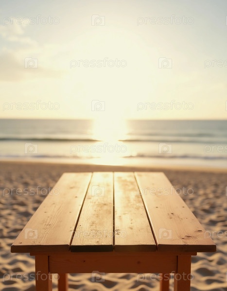 Золотые лучи освещают деревянный стол, расположенный на песчаном пляже, как нежные океанские волны на берегу, создавая спокойную приморскую атмосферу