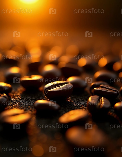 Рассеянные кофейные зерна блестят под мягким золотистым солнечным светом, их богатые цвета прекрасно контрастируют с размытым фоном природы