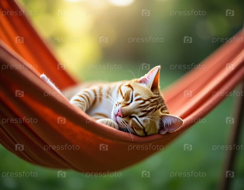 Содержимое кошек спокойно спит в ярком гамаке, охваченном мягким солнечным светом. Спокойная атмосфера на открытом воздухе усиливает безмятежность того момента, когда природа наблюдает за генерирующим ИИ