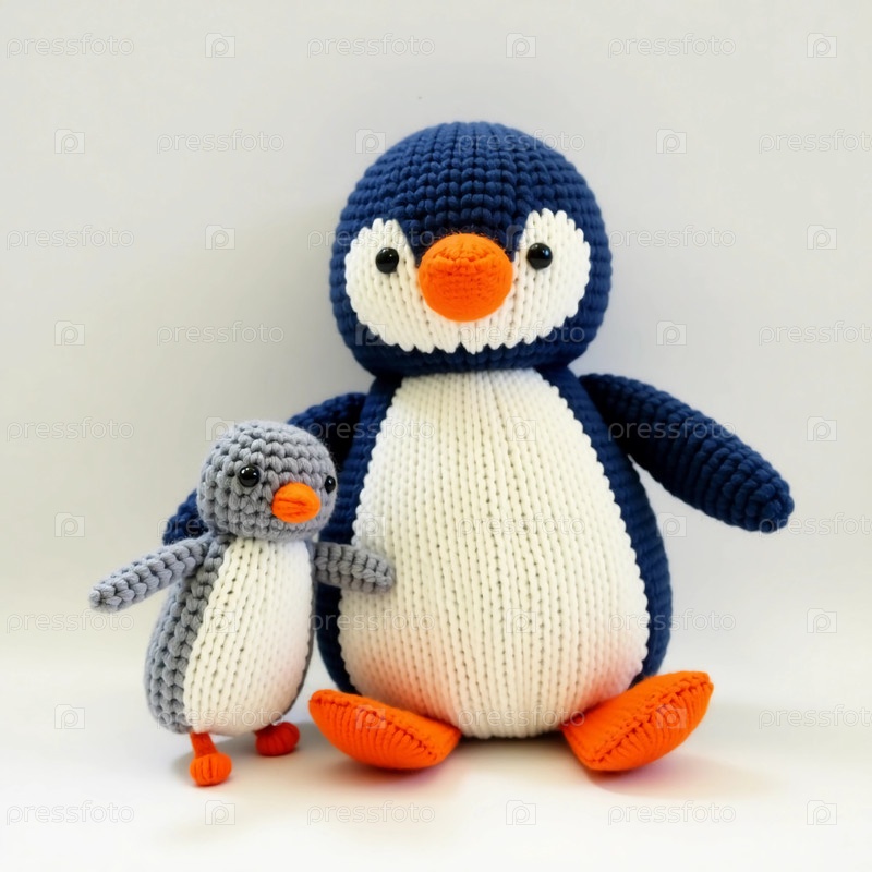 Две красиво вязаные игрушки пингвинов стоят вместе, демонстрируя свои яркие цвета и уникальный дизайн.Идеально подходят для игры и декорации, они добавляют теплоту и радость в любое пространство