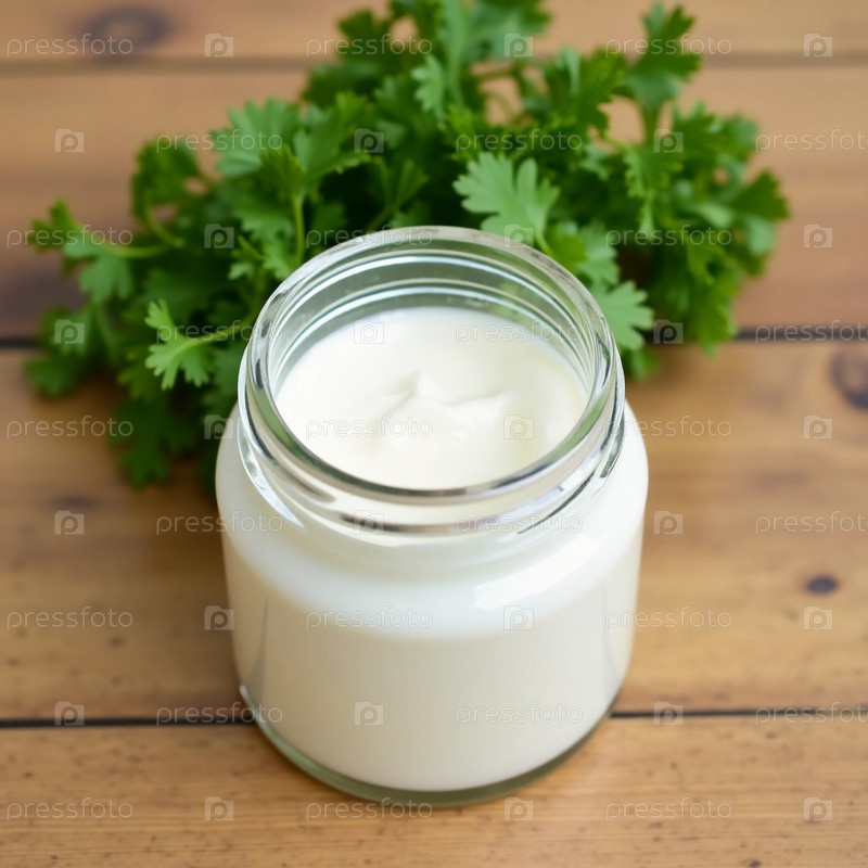 Прозрачная стеклянная банка, наполненная кремовой добротой, расположена рядом с яркими листьями петрушки на деревянной поверхности, приглашая кулинарное творчество и естественную красоту гармонично сочетаться с генеративным ИИ