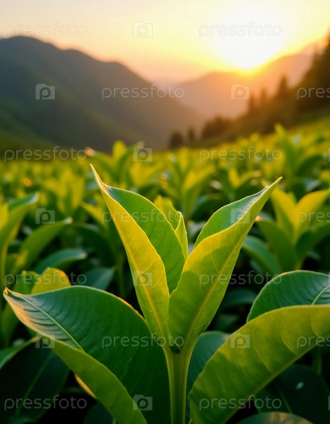 Среди холмов чайные листья процветают под теплым солнцем, символизируя спокойствие в регионах, известных своими яркими чайными культурами, включая Китай, Индию и Шри-Ланку