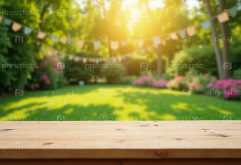 Золотой солнечный свет фильтрует пышные деревья, освещая рустический деревянный стол в ярком саду, наполненном красочными цветами и веселой овсяной мукой, идеально подходит для собраний генеративного ИИ