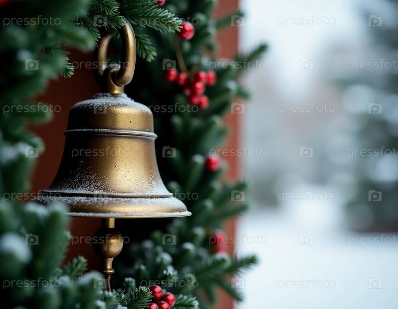 Очаровательная входная дверь имеет красиво украшенный зимний венок с винтажным колокольчиком и ярко-красными ягодами, напоминающими дух Рождества в спокойной снежной обстановке генеративного AI