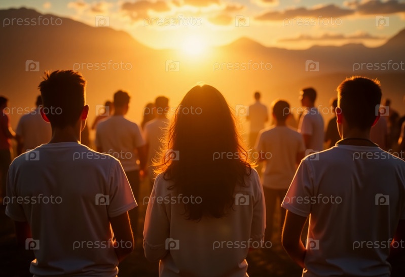 Когда солнце садится за величественные горы, группа людей объединяется в моменты молитвы, взаимодействуя со своим окружением в спокойном пейзаже, наполненном сияющим светом