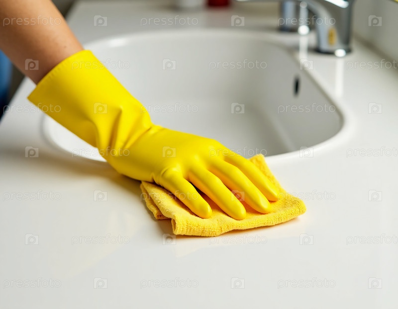 Рука, одетая в ярко-желтые резиновые перчатки, усердно очищает кухонную столешницу тканью, гарантируя безупречность всех поверхностей.Задача отражает заботу и внимание к деталям генеративного AI