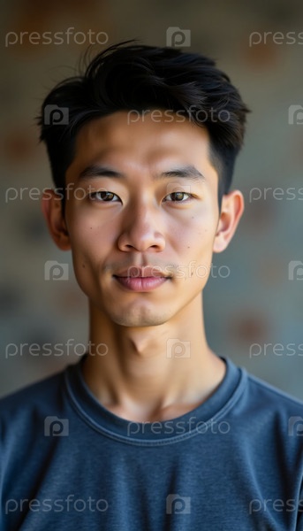 Молодой китайский мужчина уверенно стоит, демонстрируя привлекательное выражение лица на приглушенном фоне.Его современный костюм отражает сочетание традиции и современного стиля генеративного ИИ