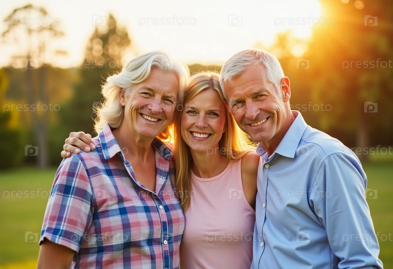 В красивом парке при закате солнца любящие бабушки и дедушки обнимают улыбающихся внука и внучку, создавая драгоценные воспоминания, наполненные теплотой и счастьем
