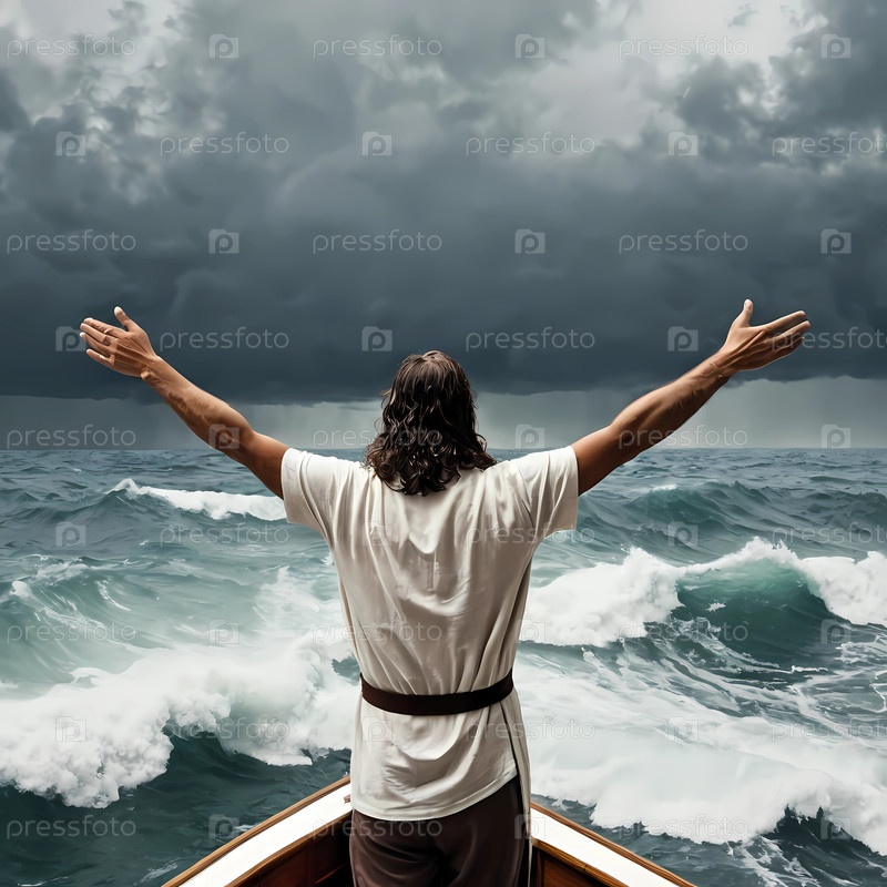 Фигура стоит с распростертыми руками на лодке, вызывая спокойствие среди бурных волн.Темные облака нависают над головой, создавая драматический контраст к тихим водам под генеративным AI