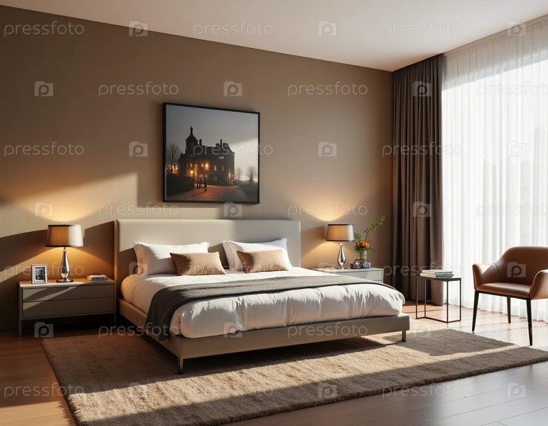 Стильная спальня демонстрирует плюшевую кровать, украшенную мягким постельным бельем, теплое освещение со светофорами и уютный стул возле большого Generative AI окна