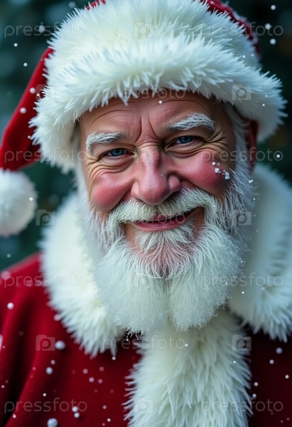 Веселый Санта-Клаус тепло улыбается в традиционной красной шляпе и пальто.Мягкие снежинки танцуют вокруг него, идеально захватывая магию праздничного сезона Generative AI