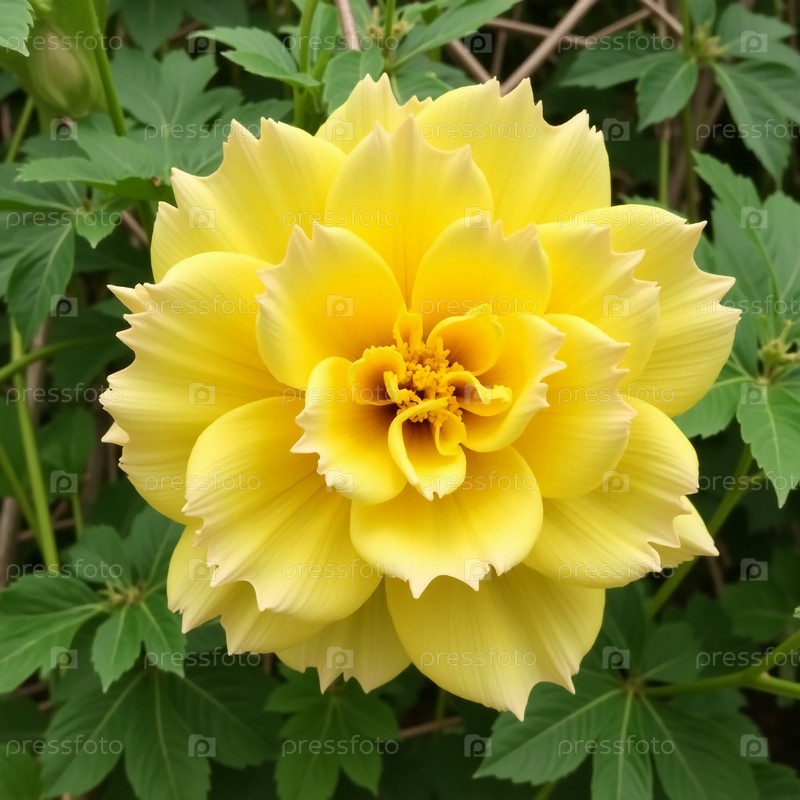 Ярко-желтый цвет далии раскрывает свои сложные лепестки, окруженные пышным зеленым листьем в общественном саду в солнечный летний день, приглашая к восхищению и радости
