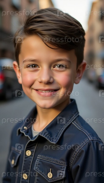 На живописной городской улице веселый канадский мальчик излучает радость, демонстрируя свою очаровательную улыбку в то время как днем солнце блестит теплым светом, усиливая его жизнерадостный дух