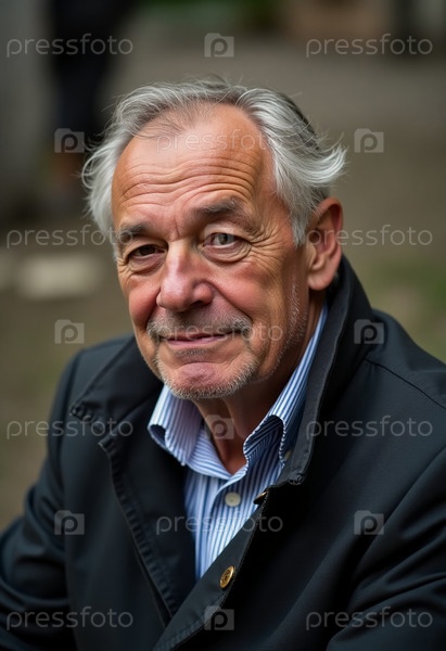 Пожилой человек излучает очарование своей нежной улыбкой и добрыми глазами, сидя на открытом пространстве в окружении пышной зелени, отражая спокойный момент жизни
