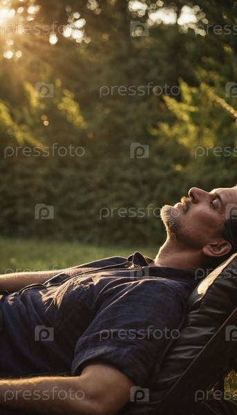 Человек тихо лежит в кресле с закрытыми глазами, наслаждаясь золотым закатом солнца. Спокойная атмосфера приглашает к созерцанию среди пышной зелени, идеально подходящей для субботнего праздника Generative AI