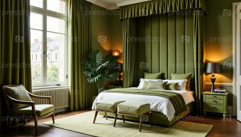 Мягкие зеленые оттенки окутывают уютную спальню с плюшевой кроватью и элегантной мебелью. естественные световые потоки, которые подчеркивают сложный дизайн и приглашают атмосферу генеративного ИИ