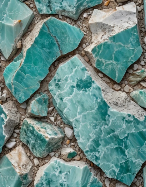 Яркие оттенки телячьего и зеленого каскада через уникальные узоры камней амазонца, сложенных между тонами глиняного гравия, демонстрируя мастерство природы Generative AI