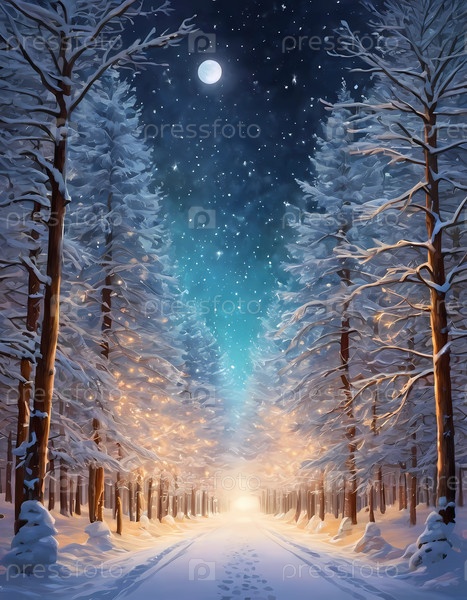 Спокойный лес, залитый мягким светом, заснеженные деревья, мерцающие праздничными огнями, создают волшебную атмосферу для празднования.Звездное небо добавляет праздничное очарование к генеративному AI