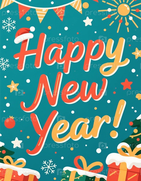 Яркие и красочные украшения празднуют Новый год с подарками, снежинками и веселыми узорами.Праздничные элементы создают радостную атмосферу для приветствия нового года Generative AI
