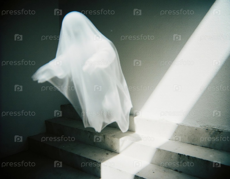 Появляется прозрачная фигура привидения, которая скользит по слабо освещенной лестнице, создавая жуткую атмосферу Хэллоуина, наполненную тайной и загадочным очарованием