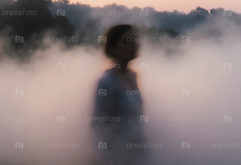 В утреннем свете женщина окутана туманом, создавая призрачное видение на фоне деревьев и тумана