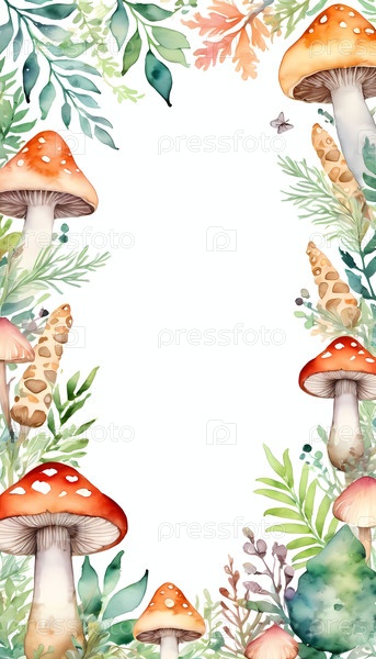 Странные акварельные грибы в оранжевых и белых оттенках создают живую границу в пустом пространстве, идеально подходит для проектов на тему Хэллоуина или генеративных ювелирных украшений с искусственным интеллектом