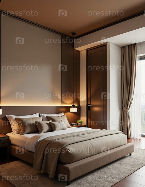 Мягкое освещение освещает стильную спальню нейтральными тонами, сочетая в себе комфорт и элегантность генеративного AI
