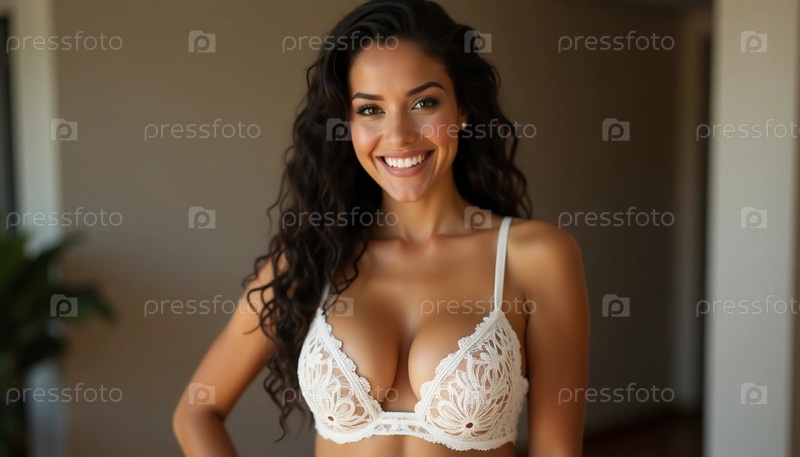 Излучая уверенность, грациозная женщина моделирует изысканное белье в солнечной комнате.Сложный дизайн и его радостное выражение подчеркивают красоту и элегантность в уютной атмосфере Generative AI