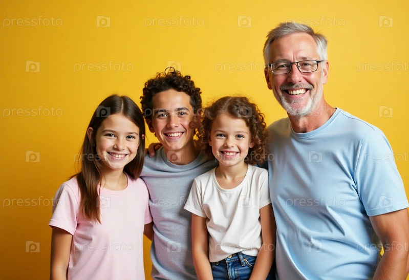 На ярко-желтом фоне радостный дед позирует со своими улыбающимися внуками, запечатлев сердечный момент их сплоченной семейной связи