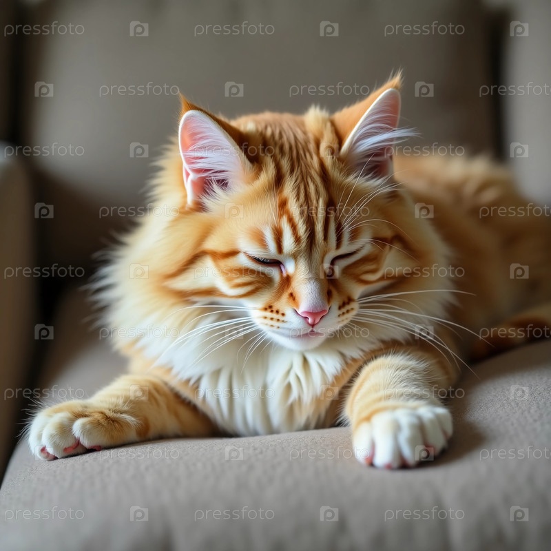 Красный пушистый кот скручивается на мягком диване, спокойно спит со закрытыми глазами.Солнечный свет фильтруется, создавая теплую и привлекательную атмосферу в уютной комнате генеративного ИИ