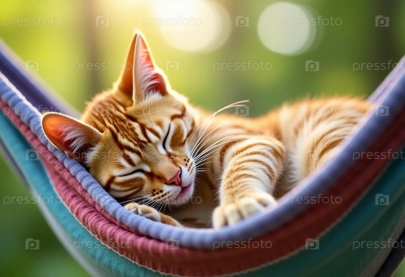 Очаровательная оранжевая полосатая кошка наслаждается спокойным сном в ярком гамаке, греясь под теплым солнечным светом, фильтруя сквозь лиственные деревья, создавая безмятежную атмосферу