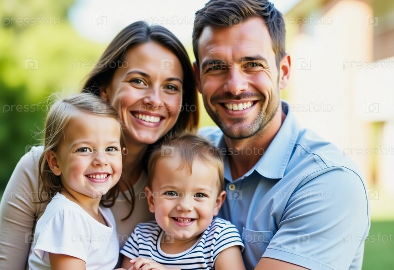 Мама и папа обнимают своих двух веселых детей в оживленном окружении на свежем воздухе, полном радости и солнечного света, когда они делятся прекрасным моментом вместе