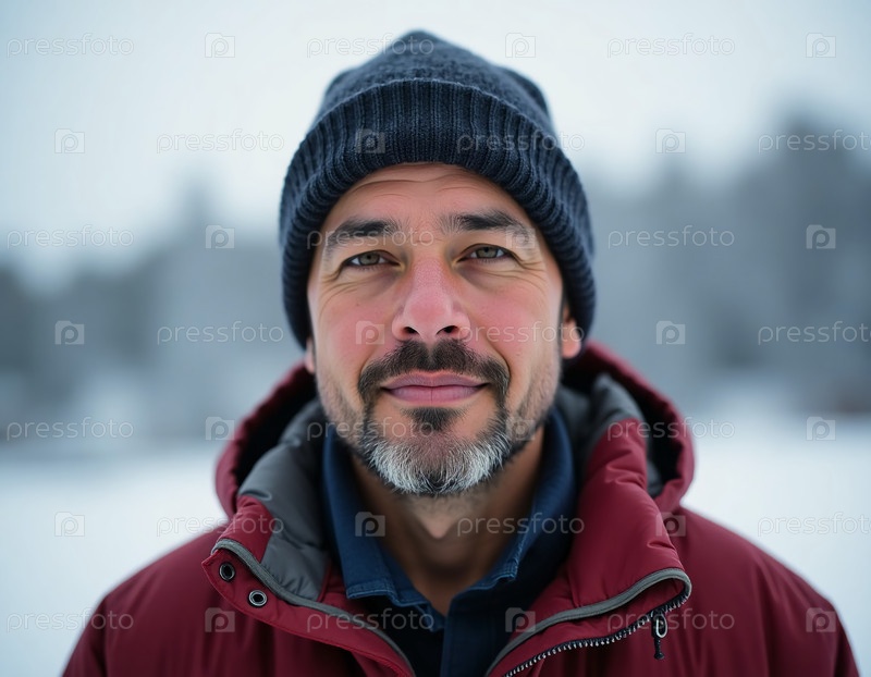 Пожилой коренной житель Аляски гордо стоит в зимней одежде, окруженный спокойным снежным ландшафтом